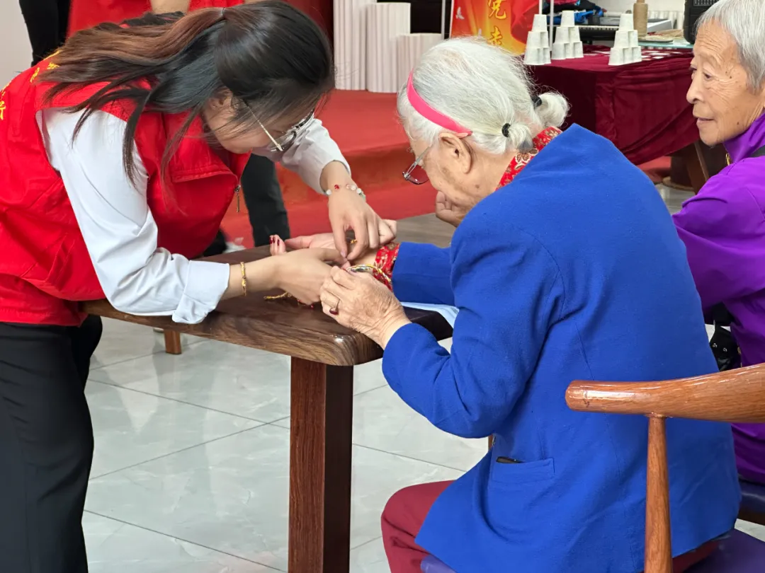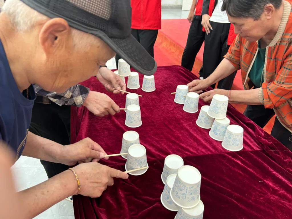 “叠叠杯挑战赛”与“翻牌记忆大冒险”游戏将现场气氛推向高潮!在“叠叠杯”环节,老人们屏息凝神,手稳心细地用筷子夹起杯子,稳稳叠放,那份专注与耐心令人赞叹。“翻牌大冒险”则考验老人们的记忆力,欢声笑语不断。获胜者喜获艾草养生锤,每位参与者都收到了志愿者们亲手编织的五彩绳纪念品。