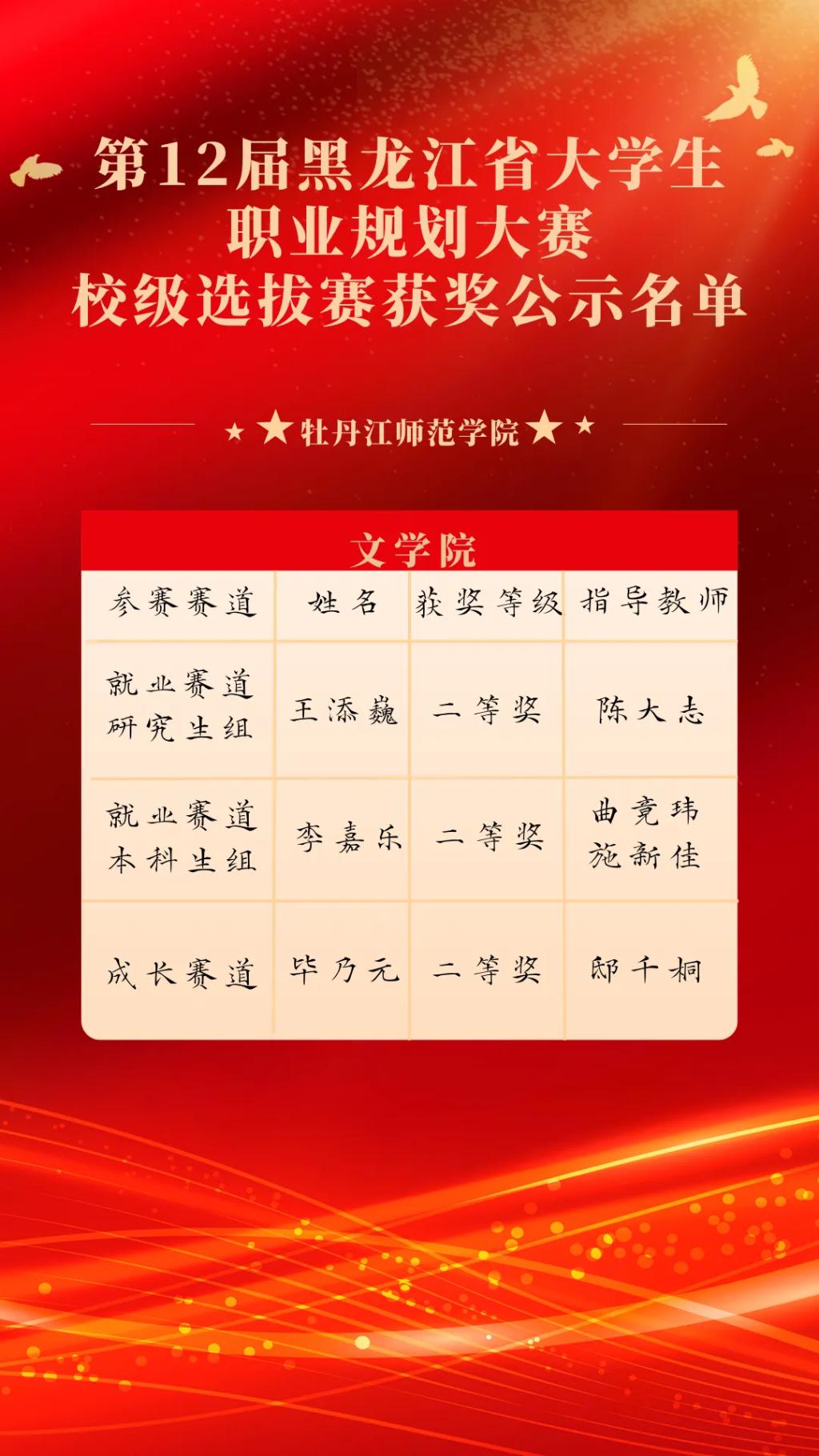 经过激烈的角逐,在就业赛道,由文学院教师陈大志指导的王添巍同学荣获二等奖,由文学院教师曲竟玮、施新佳指导的李嘉乐同学荣获二等奖,两位同学拟推荐省赛。在成长赛道,由文学院邸千桐老师指导的毕乃元同学荣获二等奖。