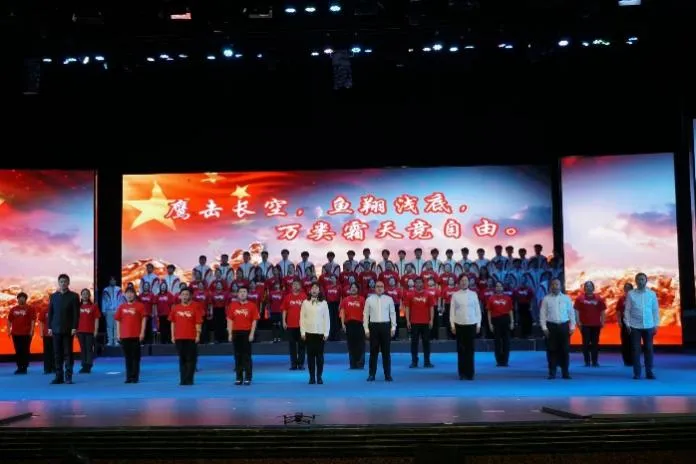 《满江红》朗诵环节,同学们满怀激情,声情并茂,将岳飞笔下“怒发冲冠,凭栏处、潇潇雨歇”的壮志豪情表现得淋漓尽致,“驾长车,踏破贺兰山缺”的报国决心更是被表现得入木三分,一句“莫等闲,白了少年头,空悲切”,激励着在场每一个人为实现理想而努力奋斗。激昂的声音在音乐厅中回荡,激发出在场每一个人内心深处的爱国情怀。