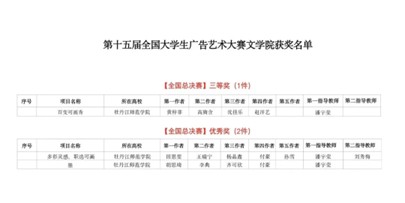 近日,第十五届全国大学生广告艺术大赛获奖情况揭晓。文学院师生在准备比赛的过程中潜心打磨、反复锤炼作品,通过不懈地努力在全国总决赛和省赛中斩获佳绩。我院学生在全国总决赛中荣获三等奖1项、优秀奖2项,在黑龙江省赛中荣获一等奖6项、二等奖4项、三等奖14项、优秀奖36项。